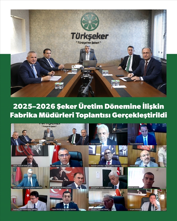 2 Eylül 2025 tarihinde çevrim içi olarak düzenlenen toplantı, Türkşeker Genel Müdürü Dr. Muhiddin Şahin başkanlığında; Genel Müdür Yardımcıları ve fabrika müdürlerinin katılımıyla yapıldı. Yeni üretim sezonuna ilişkin planlamalar, hedefler ve stratejiler toplantının ana gündemini oluşturdu.