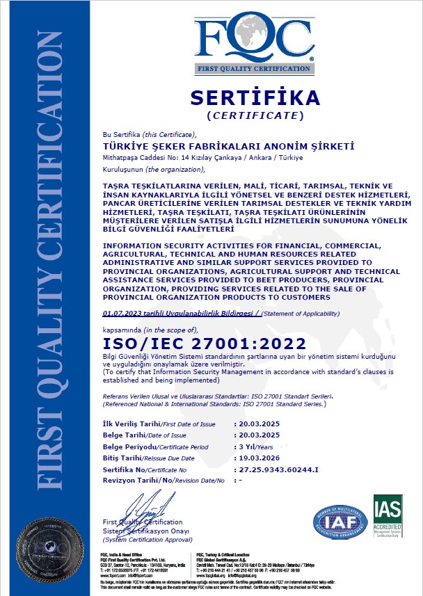 TS EN-ISO/IEC 27001:2013 Bilgi Güvenliği Yönetim Sistemi çalışmaları tamamlanmış ve 13.03.2018 tarihinde sertifika alınmış; 2021 yılında versiyon değişikliği çalışmaları yapılarak TS EN-ISO/IEC 27001:2017 versiyonuna geçilmiştir.